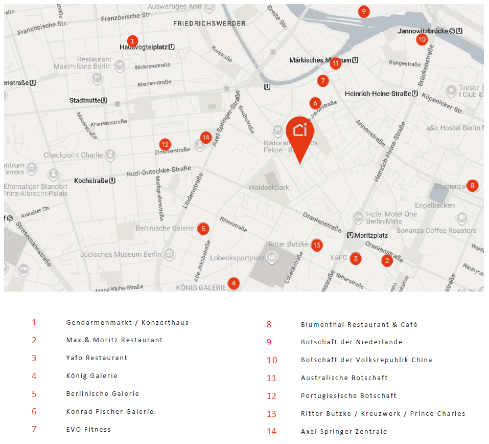 Die Wohnung befindet sich in Mitte auf dem ehemaligen Mauergrundstück an der Grenze zu Kreuzberg und bietet eine zentrale Wohnlage, die urbanes Leben mit Ruhe verbindet. Hier vermischt sich der diskrete Charm des Diplomaten- und Zeitungsviertels mit der urbanen Energie rund um die Oranienstraße mit seinen vielen Geschäften, Restaurants und Kaffees. Sowohl die U2 (Spittelmarkt) als auch die U8 (Moritzplatz) sind nur 7 Gehminuten entfernt.